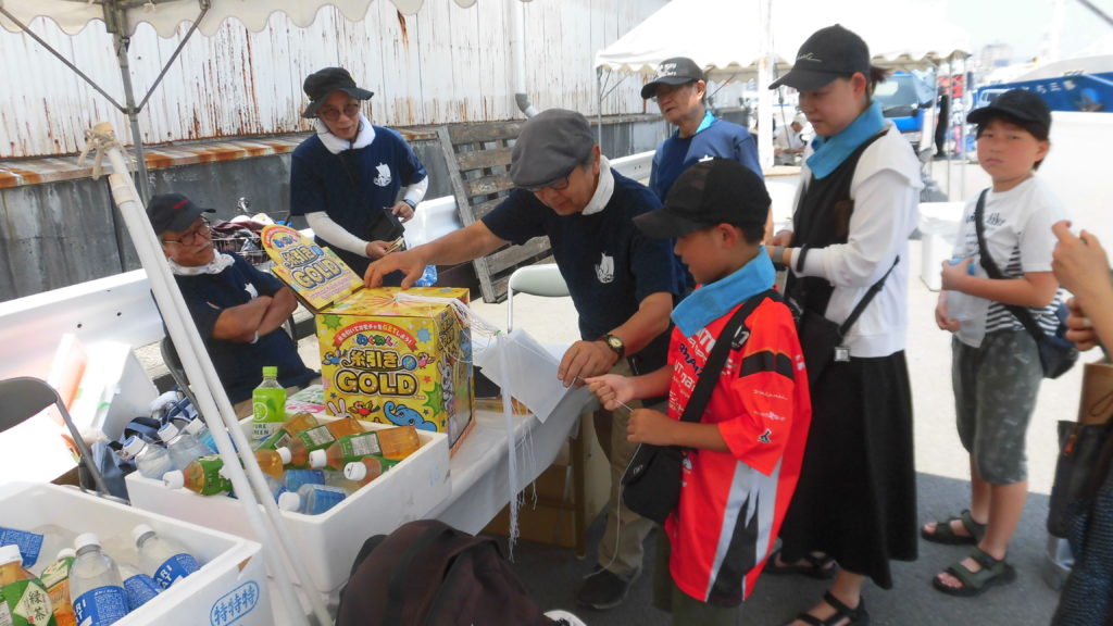炎天下の中、冷たい飲料をいただき100円で糸引きくじを楽しみました。