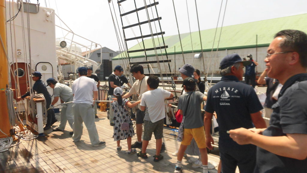 250人もの枠を超える申込みがあり、親子連れ、高齢者などが船内を見学し、スタッフの人たちと一緒に帆を張る貴重な体験をしました。