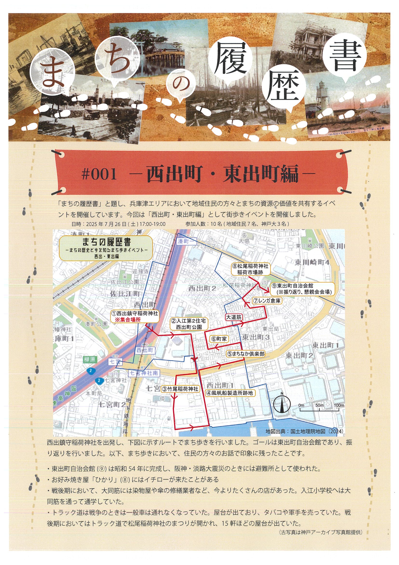 2025年7月26日(土)、神戸大学大学院工学研究科建築学専攻山口研究室の院生が「まちの履歴書」と題し、兵庫津エリアの地域住民の方々と、まちの資源の価値を共有するイベントを開催しました。